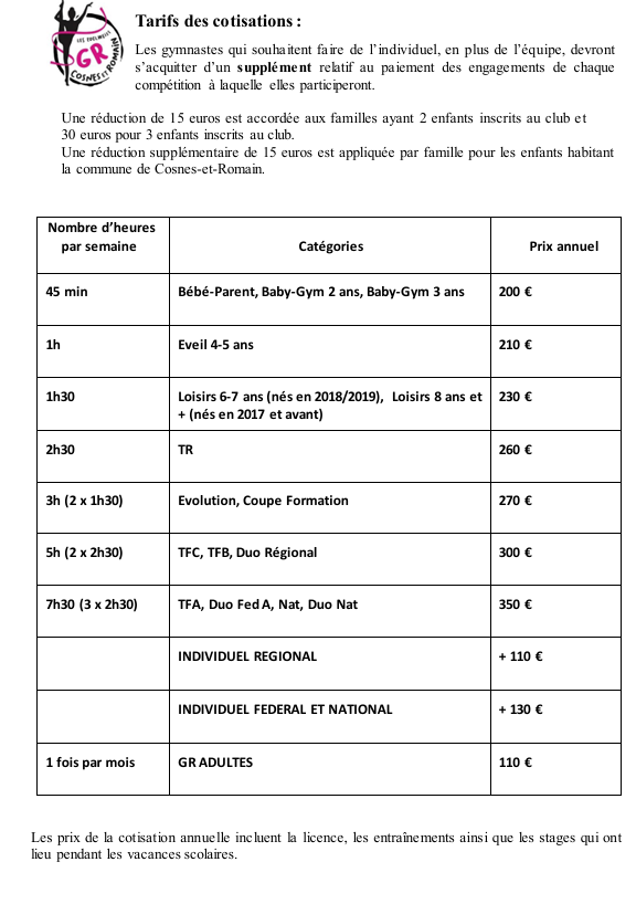 Tarifs pour les différentes sections pour l’année 2025-2026: